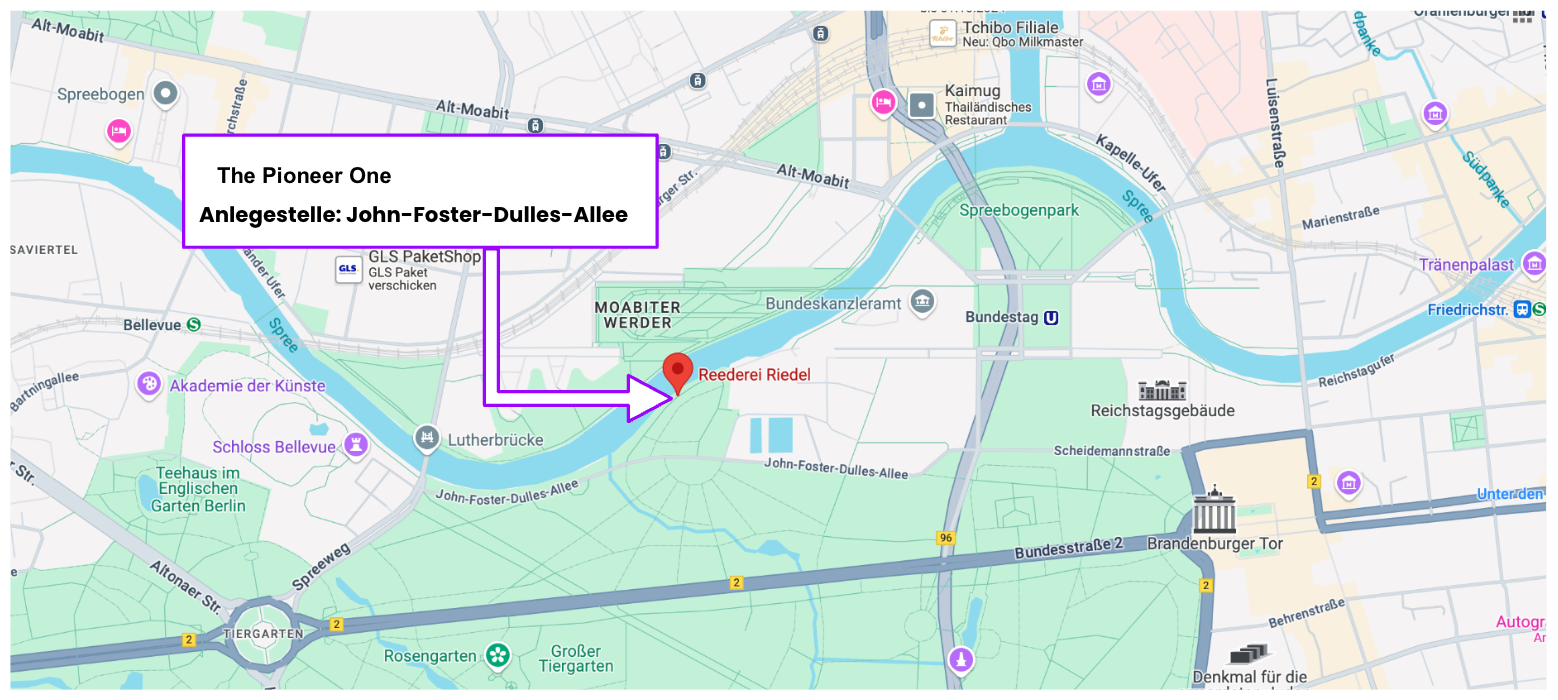 Anleger: Reederei Riedel, Bettina-von-Arnim-Ufer 4, 10557 Berlin (200 Meter von Haus der Kulturen entfernt, wie auf der Grafik markiert, oberhalb der John-Foster-Dulles-Allee)