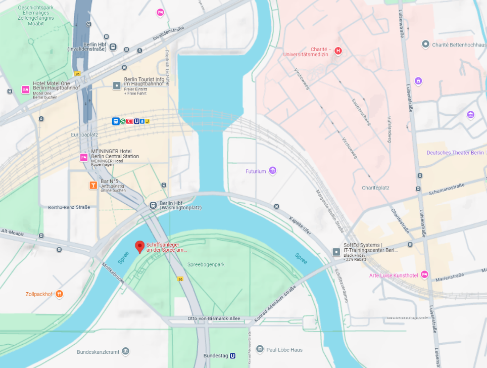 Anleger: Schiffsanleger an der Spree, Ludwig-Erhard-Ufer, 10557 Berlin, neben der Moltkebrücke, wie auf der Grafik markiert, gegenüber des Hauptbahnhofs.
