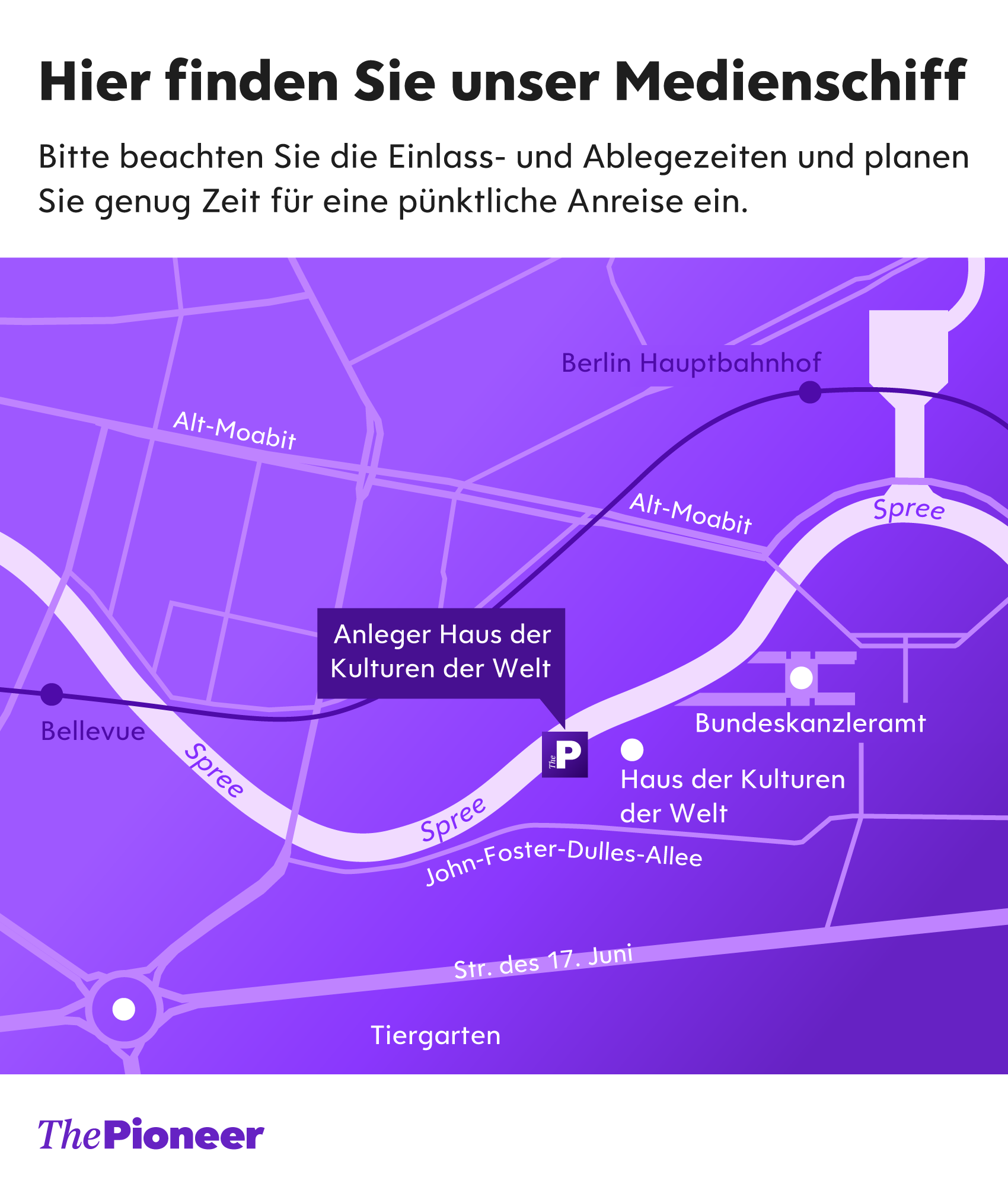 Anleger: Reederei Riedel, Bettina-von-Arnim-Ufer 4, 10557 Berlin (200 Meter von Haus der Kulturen entfernt, wie auf der Grafik markiert, oberhalb der John-Foster-Dulles-Allee)